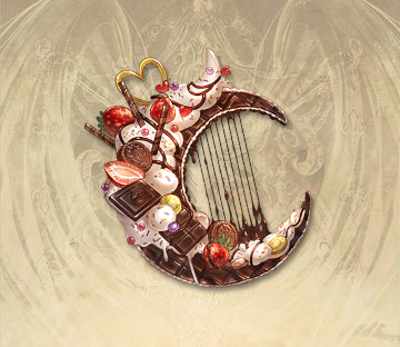 イチゴにチョコレート、生クリームやビスケットで贅沢にデコレーションを施された三日月形のハープ。無性にかぶりつきたくなるほどの意匠であるが、あくまで楽器。齧ればたちまち歯が欠ける。遊び心たっぷりの見た目とは裏腹に、胸を打つ魅惑的な音色。今宵、甘き時間を過ごす一助となろう。