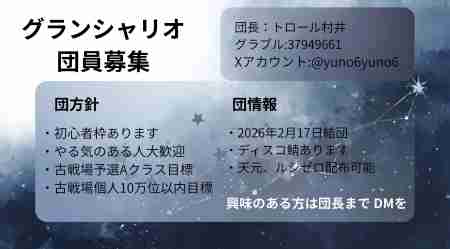 古戦場に積極的に取り組む方を募集しています。目安としては直近3古戦場で12万位以内を継続されている方。やる気さえあれば今のランクは問いません。